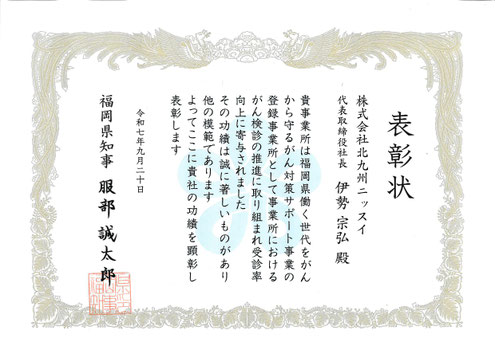 2024年「福岡県がん対策よか取り組み対策事業所知事表彰」を受けました。